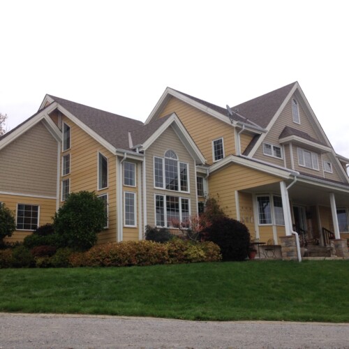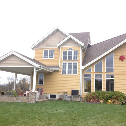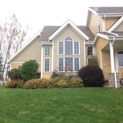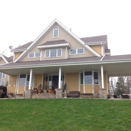 This is a project in Adjala township, near Alliston, where the client wanted to replace some of the existing plank siding with some Maibec siding to create a contrast. The yellow siding is the existing Hardie board siding and the Maibec siding is the beige shake style.